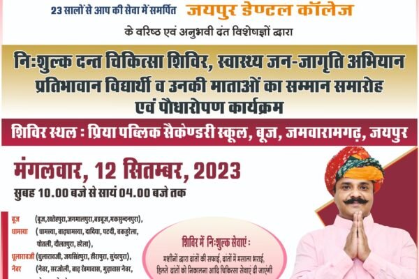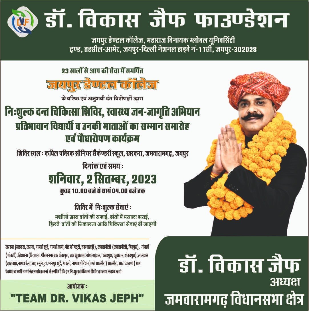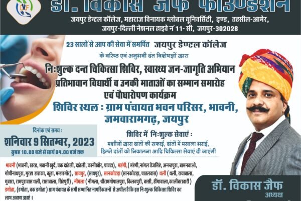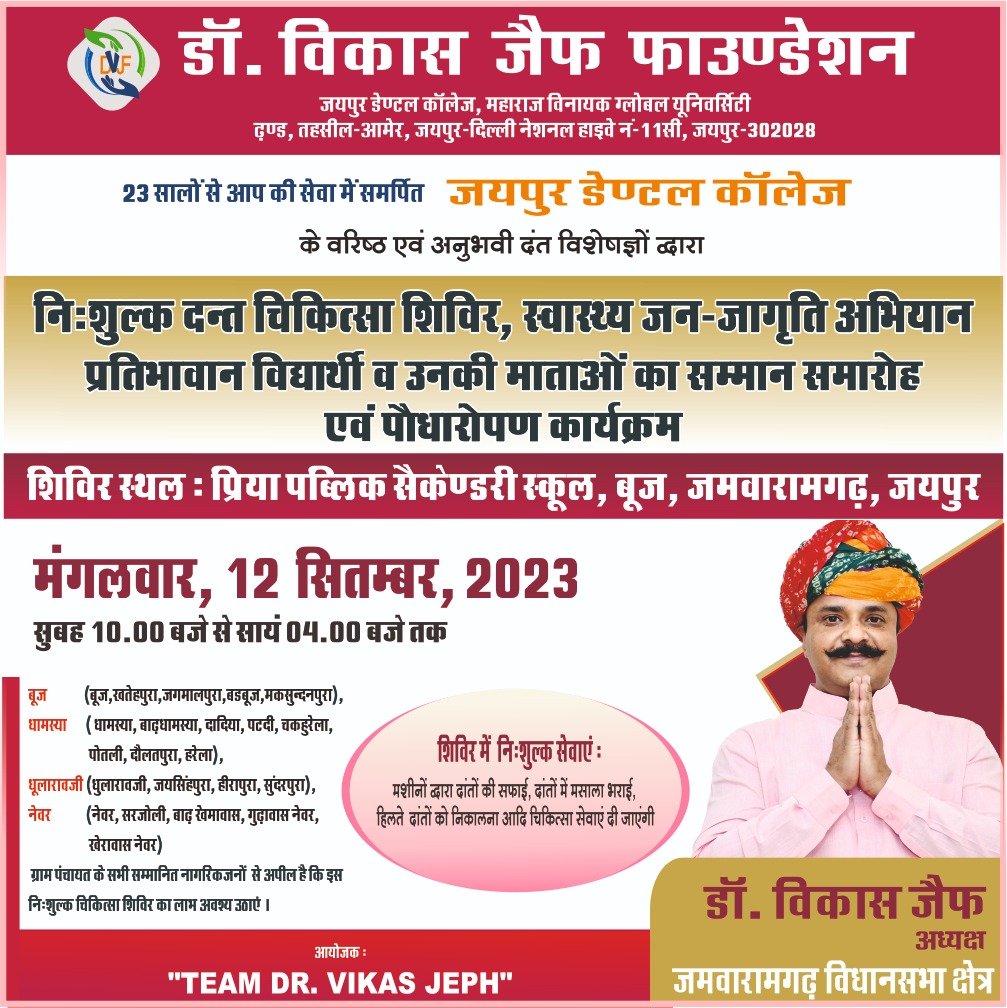 डॉक्टर विकास जैफ फाउंडेशन, हमेशा आपकी सेवा में समर्पित है।12 सितंबर को सुबह 10 बजे से शाम 4 बजे तक, बूज जमवा रामगढ़, जयपुर में एक नि:शुल्क डेंटल चेकअप शिविर, स्वास्थ्य जागरूकता अभियान, सभी प्रतिभागियों और उनकी माताओं के साथ एक सम्मान समारोह और पेड़ लगाने का कार्यक्रम आयोजित किया जाएगा। हम आप सभी को…