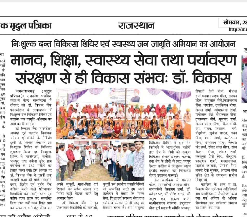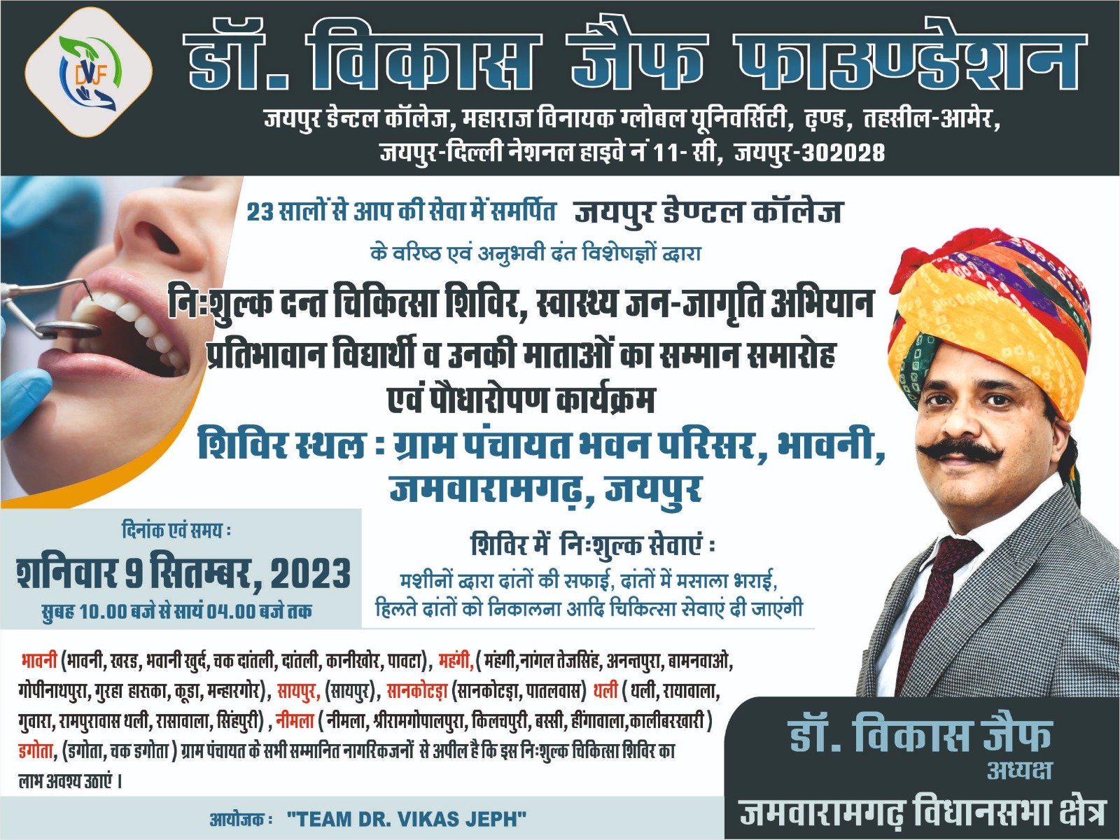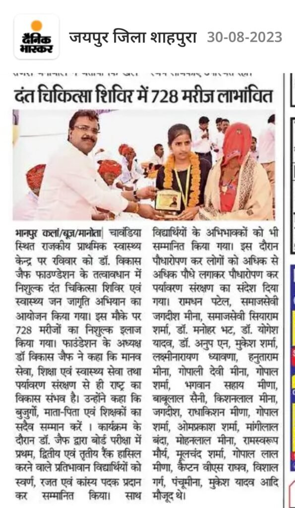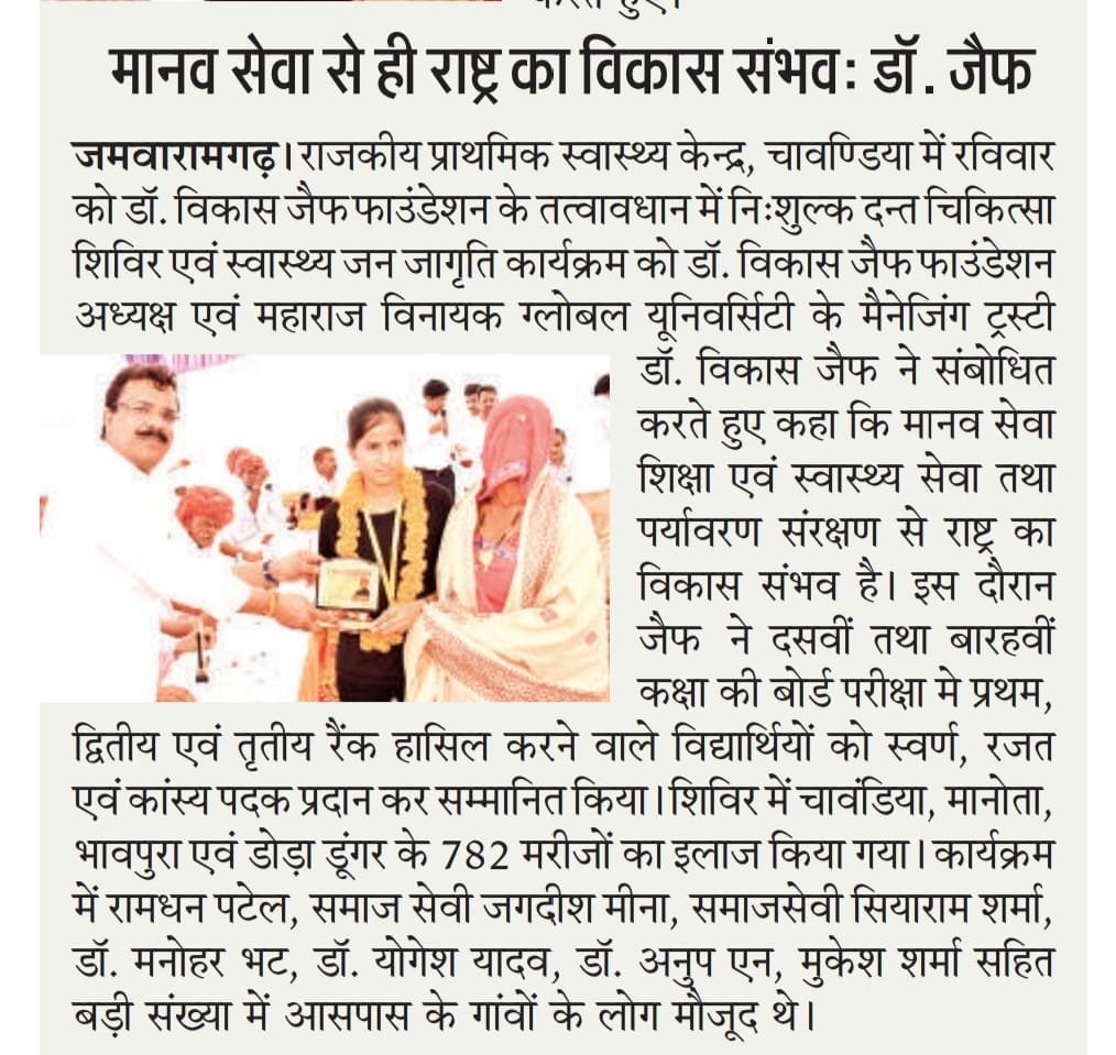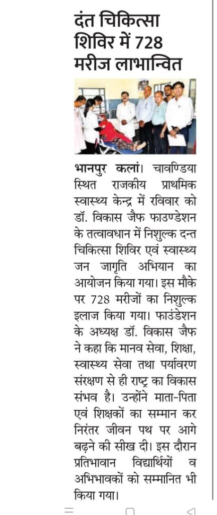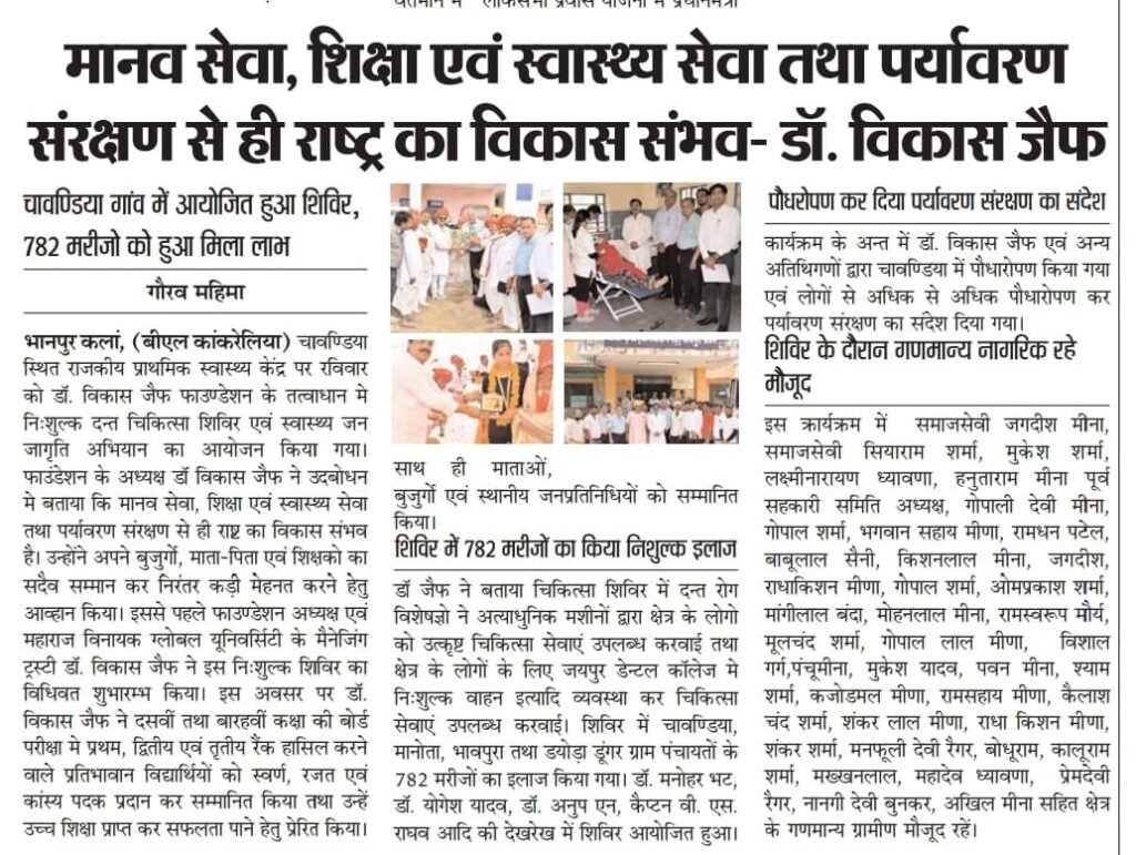 डॉ विकास जैफ फाउंडेशन द्वारा चावंडिया में निःशुल्क दंत चिकित्सा शिविर, पौधरोपण एवं प्रतिभा सम्मान समारोह का आयोजन किया गया। इससे चावंडिया ग्राम पंचायतों के लोगों की सेवा करने का मौका मिला। साथ ही, सभी प्रतिभावान गणों का अभिनंदन करने का अवसर मिला। सभी गणमान्यों को धन्यवाद।